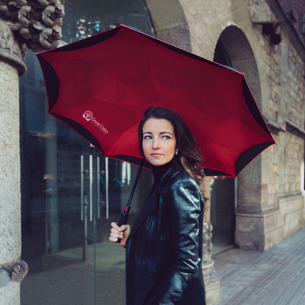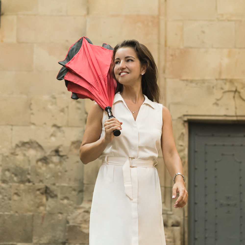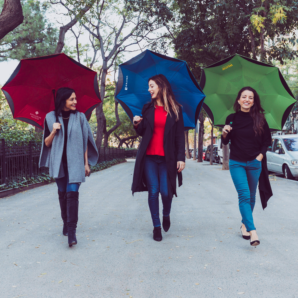 The award-winning auto-open Inversa Inverted Umbrella is designed to not only protect you from the rain, but also from a rain-soaked umbrella. With a 48" arc, double-layer canopy and all-fiberglass construction, the windproof Inversa closes in reversible fashion, keeping the wet side of the umbrella contained and away from you. This intelligent design also makes it easier to open and close from inside doorways and cars, so you stay dry from start to finish. The Inversa is self-standing when closed, and includes an undercanopy Velcro strip for the wide tie, for additional convenience and storage options.