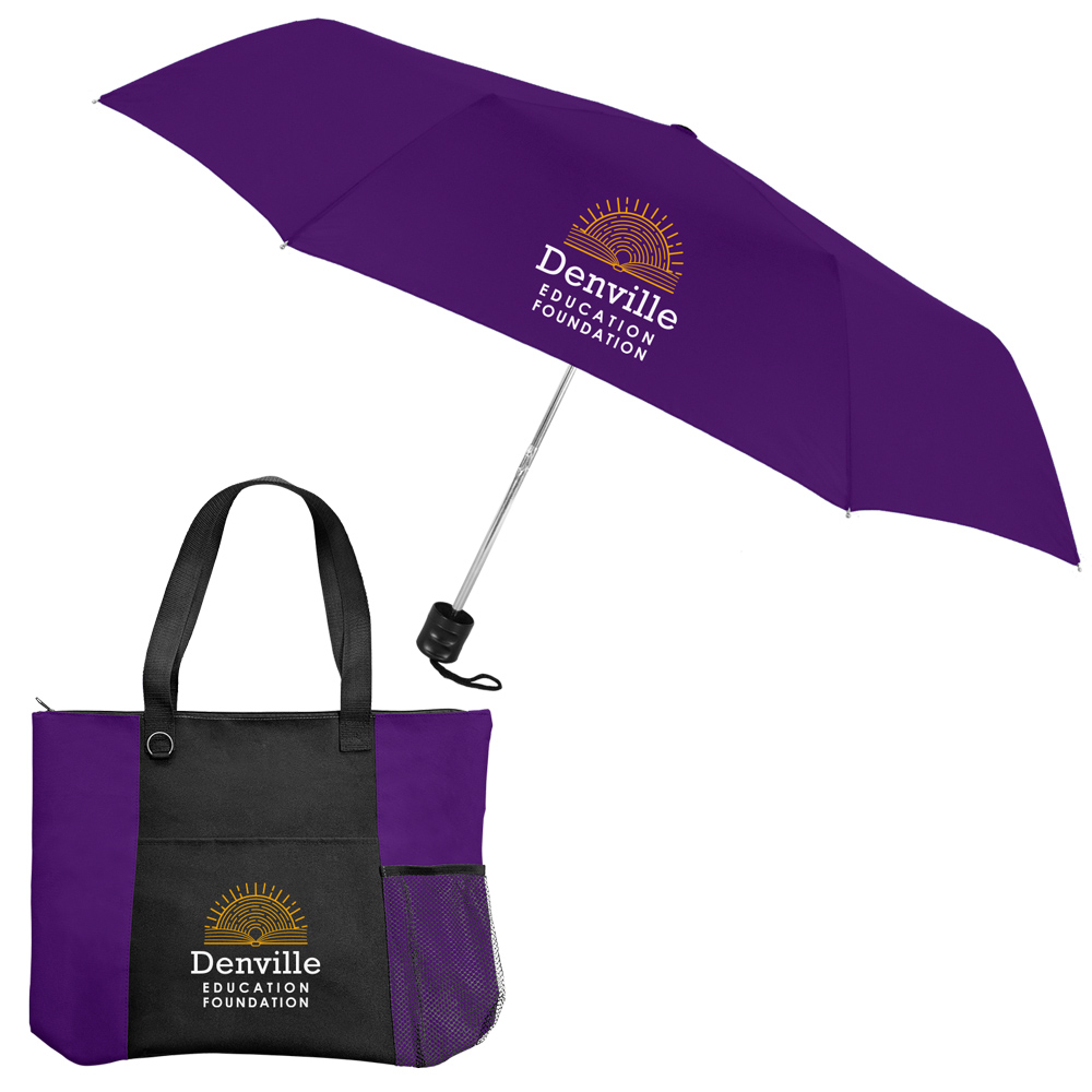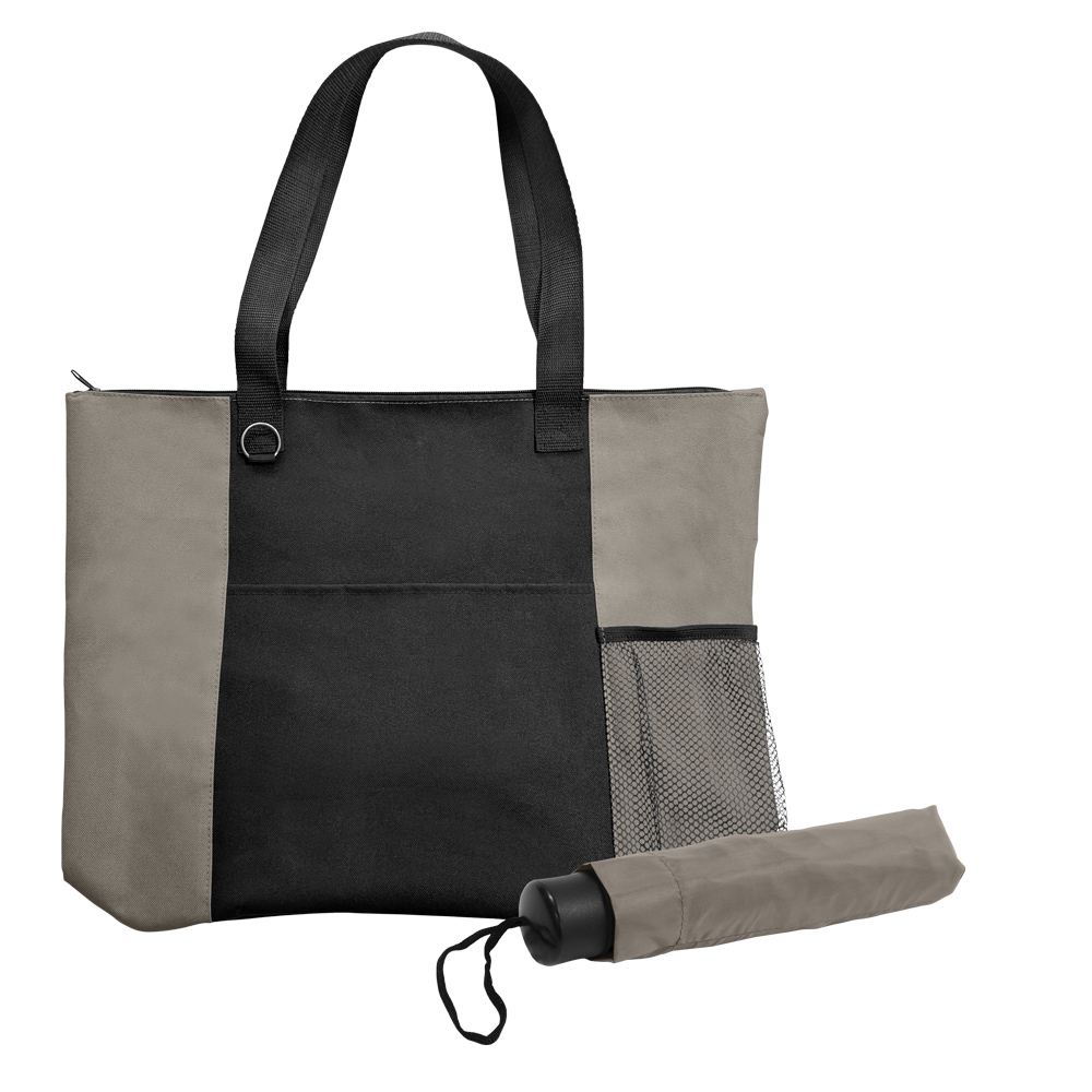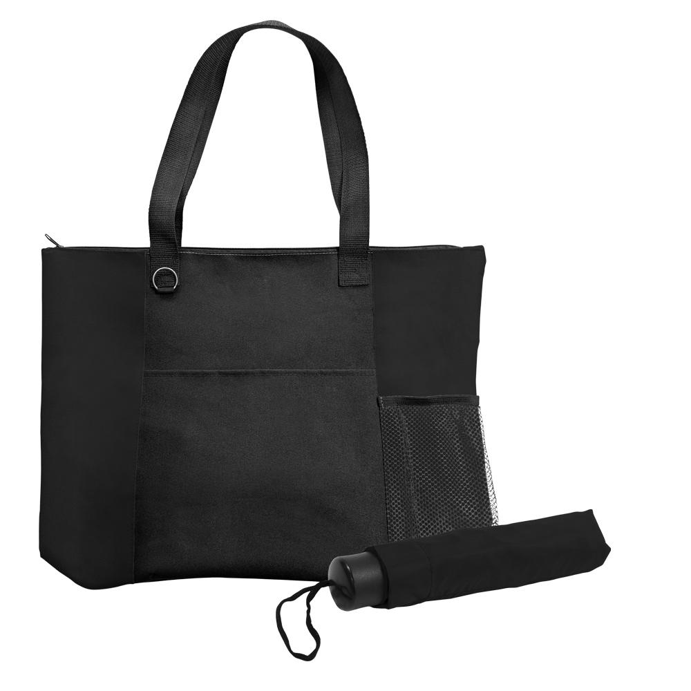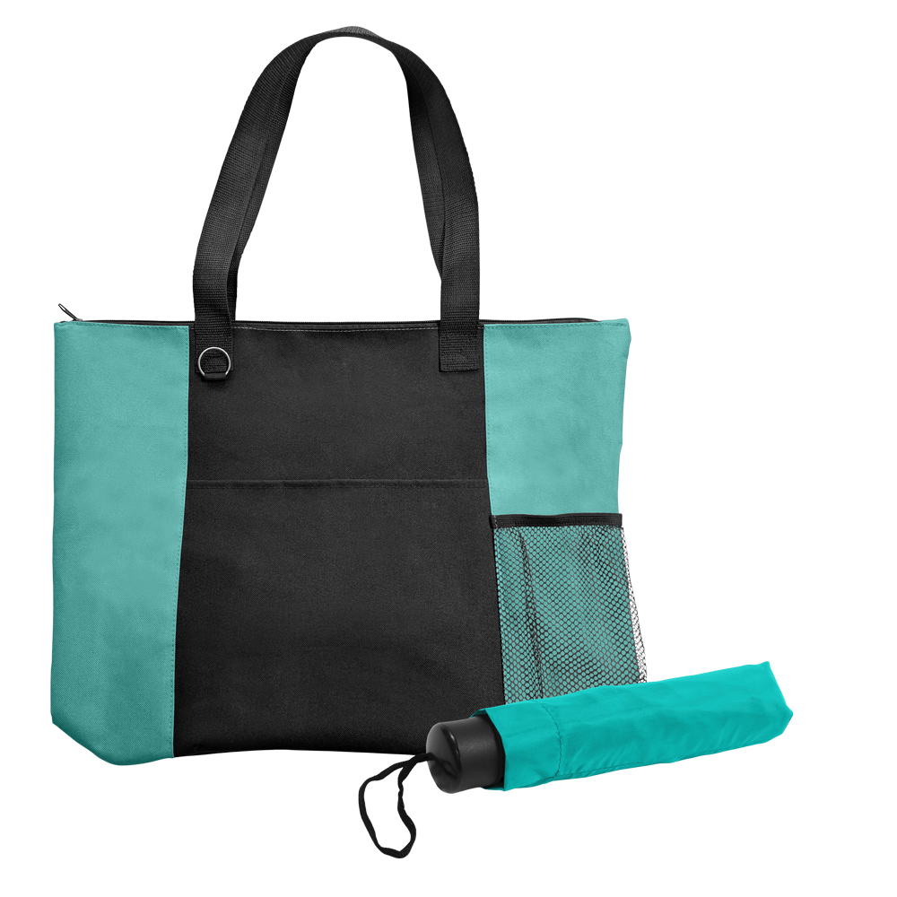 Two great items, one great set! Combining our durable 600D polyester Mariner Zippered Boat Tote Bag with our popular and most compact folding umbrella, the 41" arc canopy Compact Econo, makes for a great promotional gift everyone will appreciate receiving. Just slip the umbrella into the handy mesh side pocket so you’ll be prepared for any weather – rain or shine! The Mariner measures 19" x 15" with a 6" gusseted bottom, has 12" handles making it easy to carry, and the zippered main compartment ensures the contents will remain secure. A split ring key attachments also included for added convenience. Take it on a boat, or to the beach, pool, park, or around town, and concentrate on fun in the sun! Available in several sharp colors with contrasting black trim.